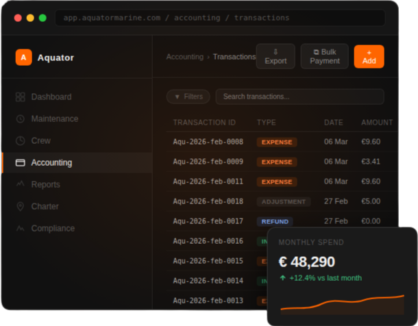Aquator's Family Office module brings balance-sheet discipline and real-time cost transparency to superyacht ownership — purpose-built for UHNWI and family office expectations.