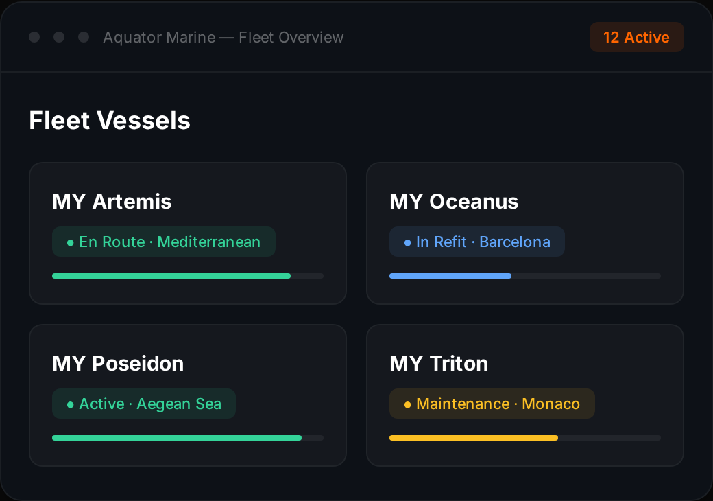 Purpose-built for yacht management companies, fleet operators, and shipyards. Aquator Business Plans give you full operational visibility across every vessel, every department, and every decision.