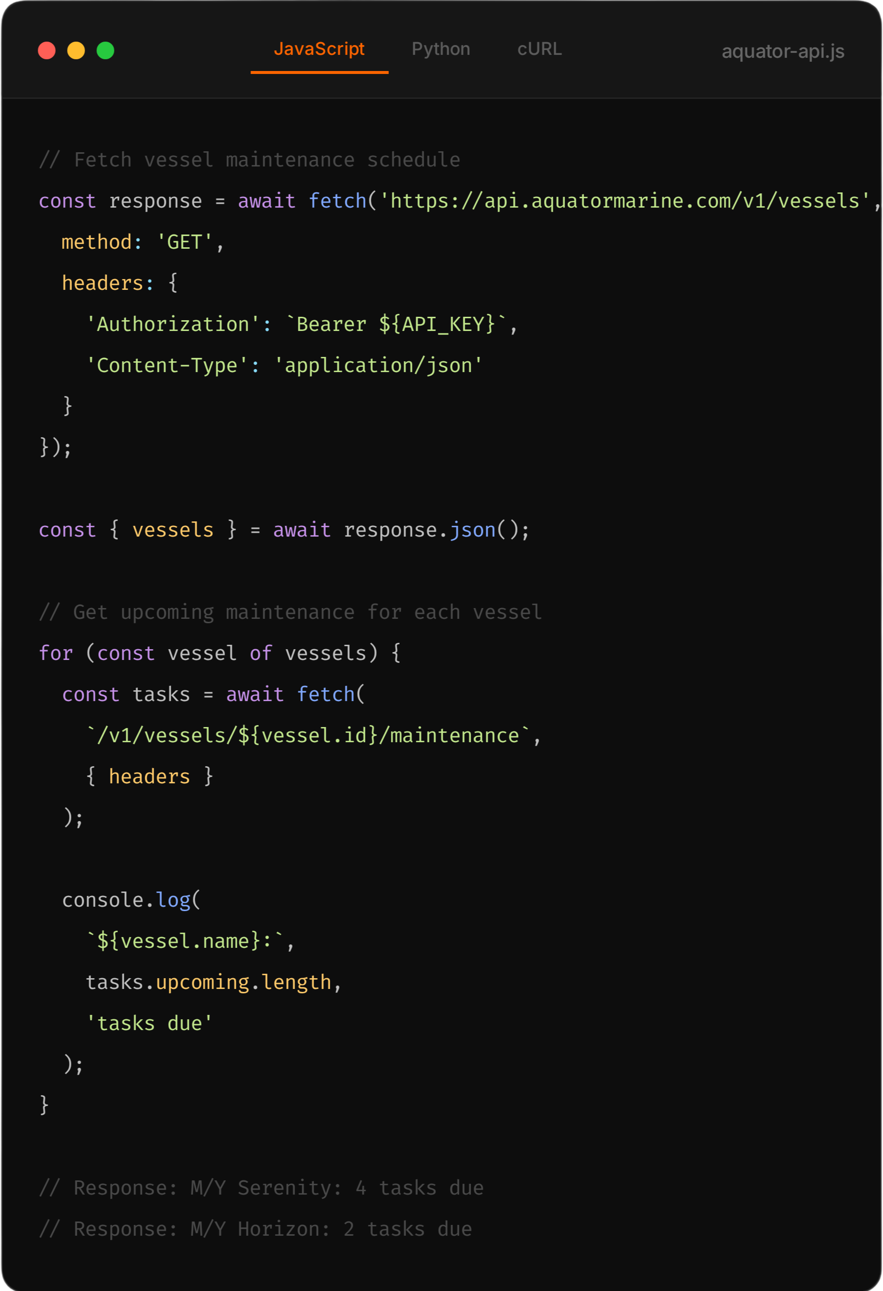 RESTful APIs, webhooks, and SDKs for developers who need to build custom integrations, automate workflows, or embed Aquator into their own maritime platforms.