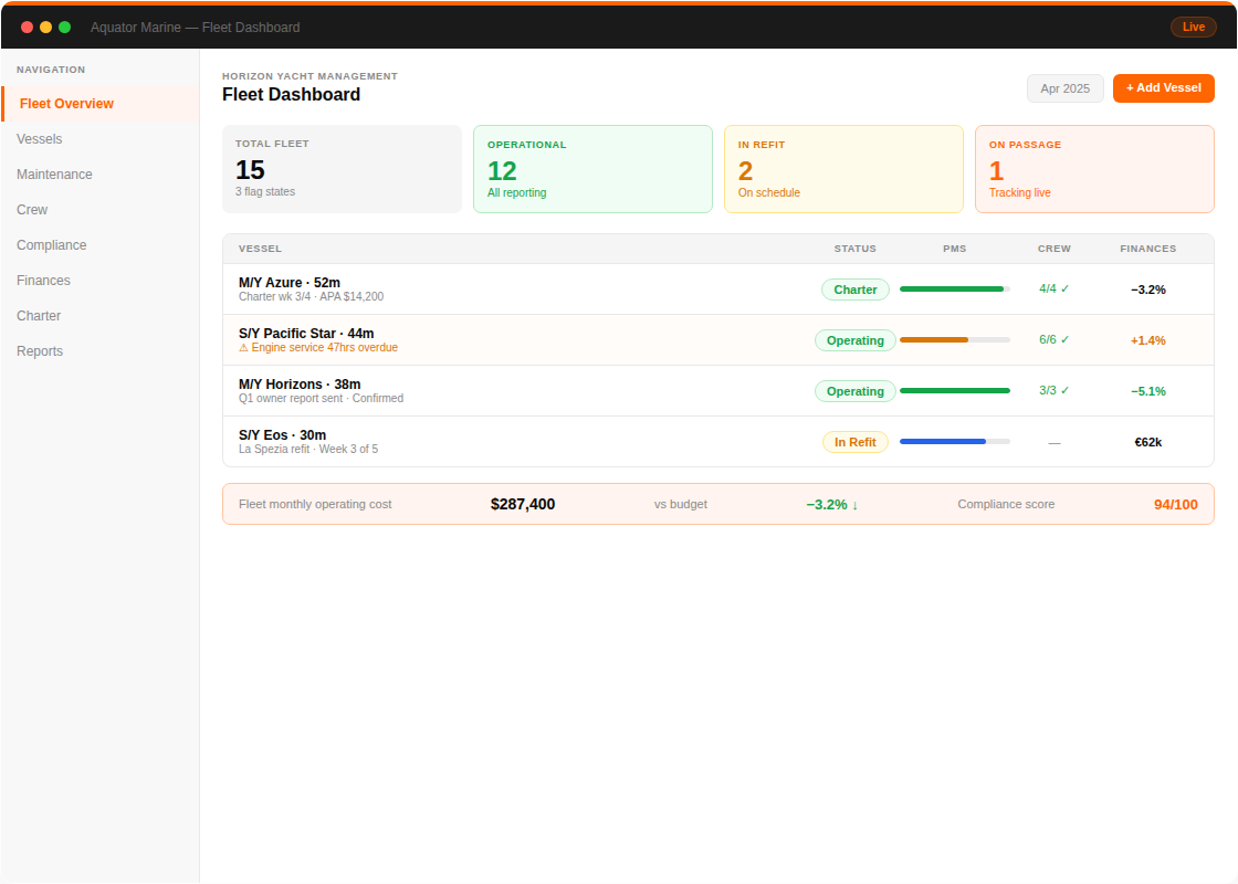 A yacht management company running 15 vessels across three flag states and six ownership structures shouldn't be operating from spreadsheets, WhatsApp, and email threads. Aquator gives fleet managers a single operational platform that every vessel, every captain, and every owner connects into — with standardised workflows across the entire portfolio.