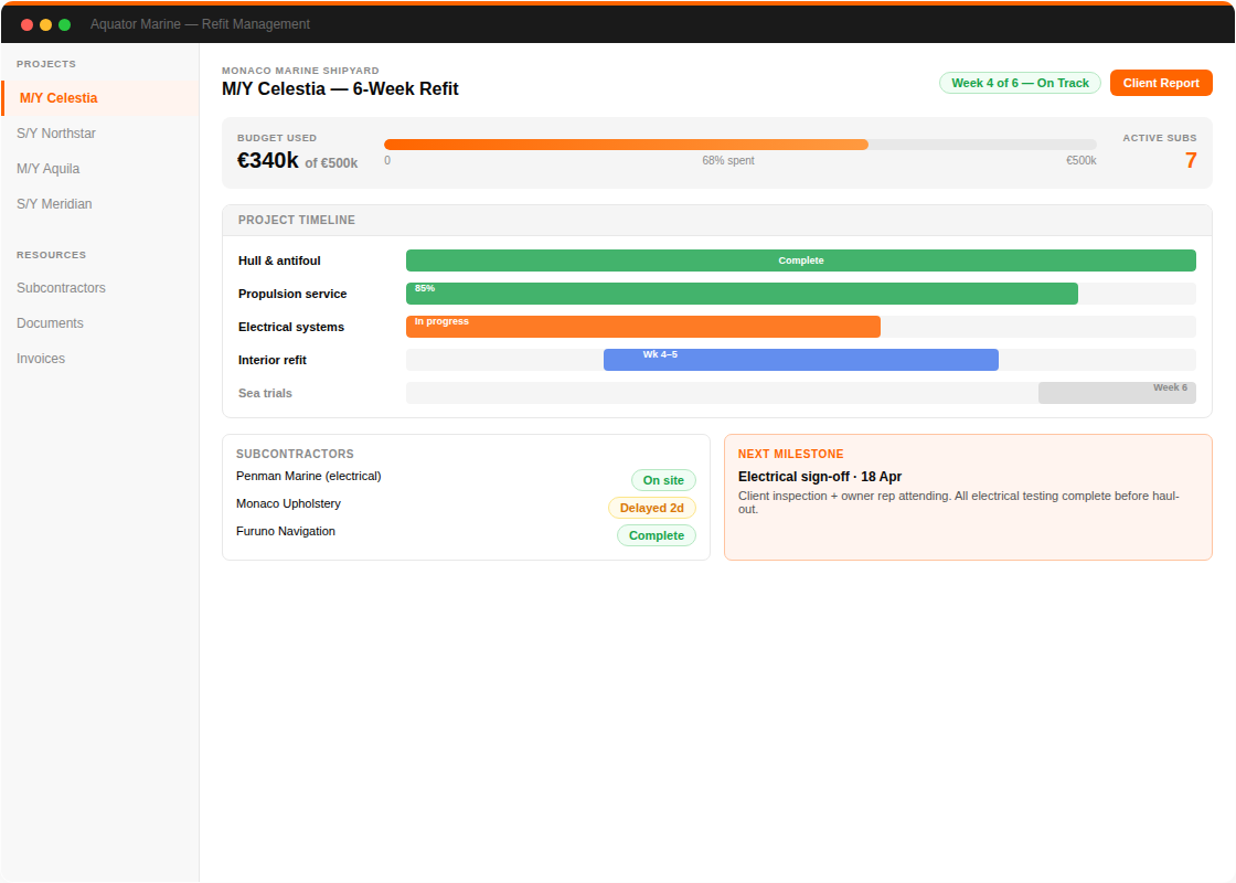 Shipyards managing multiple concurrent refits face a coordination problem that no general project management tool is built for. Aquator's Shipyard Plan combines Gantt project management, subcontractor work orders, budget tracking, and client reporting in a single platform purpose-built for the realities of a busy yard — including warranty management and digital vessel handover on completion.