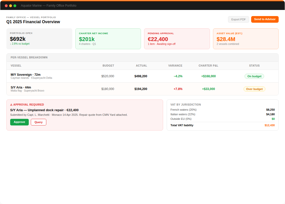 A superyacht is simultaneously a depreciating capital asset, an operating business, a VAT-registered vessel, and an insurance risk — often held across multiple jurisdictions with a management company, captain, and family office all needing different views of the same financial picture. Aquator's Family Office Plan brings the institutional oversight that wealth managers expect to an asset class that has never had it.